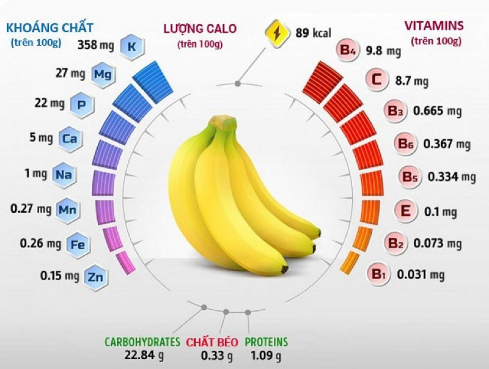 Chuối chứa một lượng vừa phải chất xơ và một số chất chống oxy hóa. Một quả chuối cỡ thông thường (126g) cung cấp 112 calo, 1g đạm, 29g tinh bột, 3g chất xơ, chứa các vitamin, khoáng chất như vitamin C, riboflavin, folate, kali, magie…